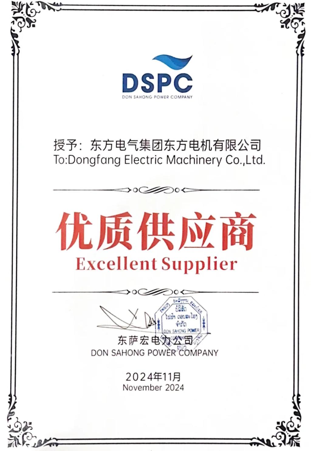 東薩宏電力公司向東方電機頒發的“優質供應商”證書,是對機組運行優異的最好證明。