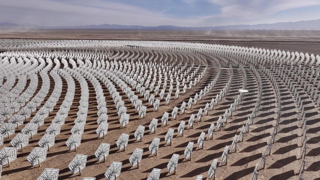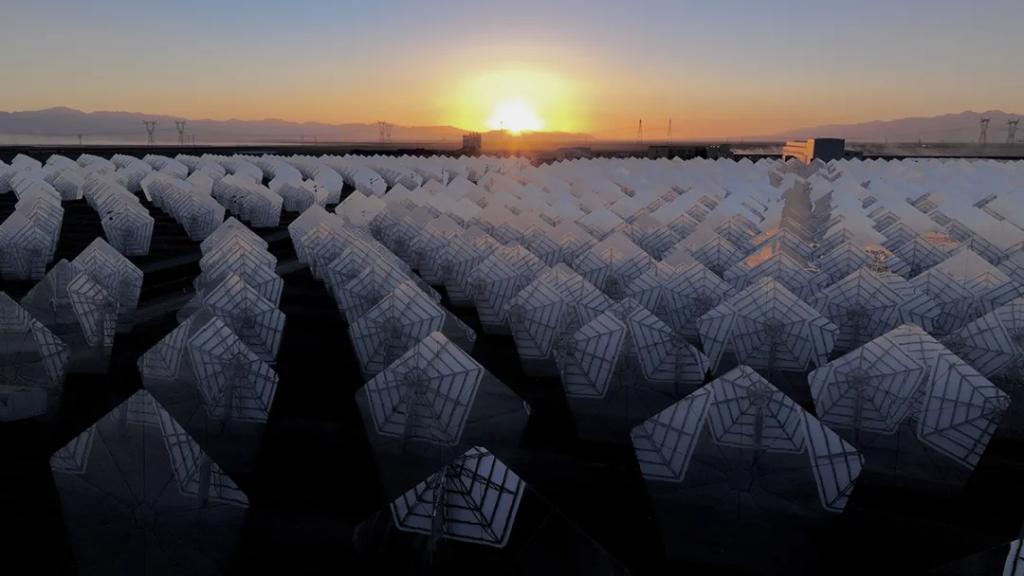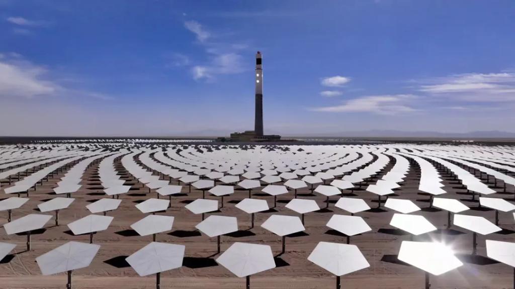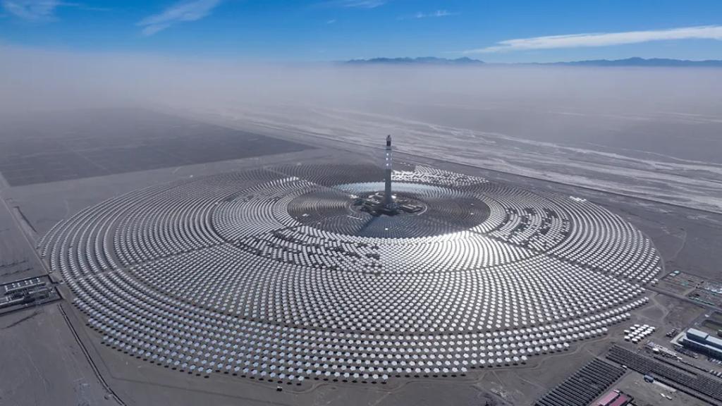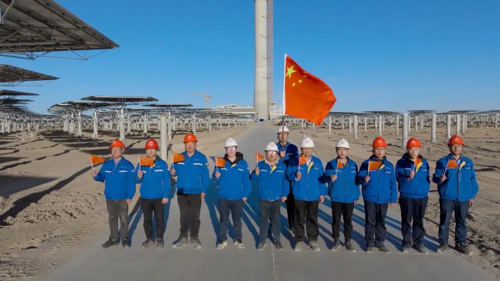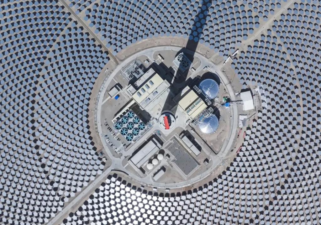 2024年1月,全部11960面五邊形定日鏡完成安裝。2024年11月,成功實(shí)現(xiàn)聚光集熱系統(tǒng)首次熱態(tài)升溫運(yùn)行(熔鹽上塔)。