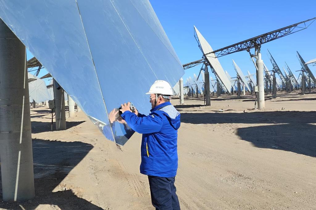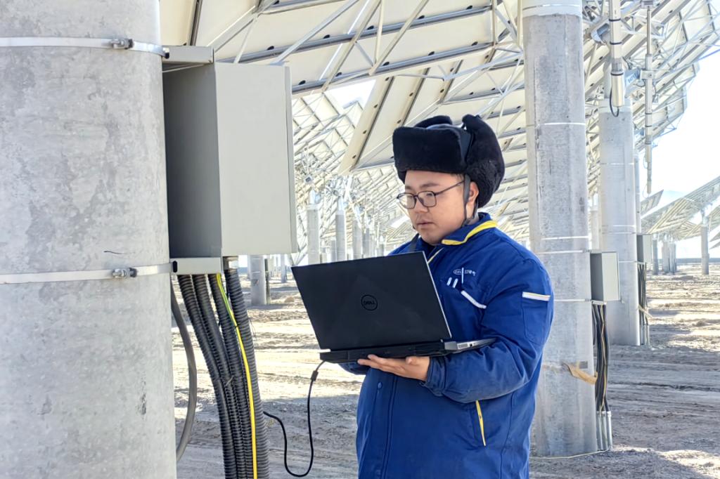 在甘肅阿克塞匯東新能“光熱+光伏”項目現場,零下10度的環境下,東方鍋爐項目團隊成員林雪松在進行定日鏡清潔度抽查工作,以確保定日鏡聚光反射太陽能的精確性能;東方自控王強開展鏡場LOC箱設備調試工作,為聚光集熱做準備。