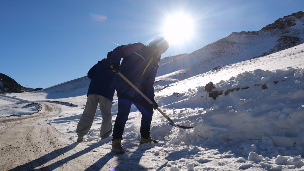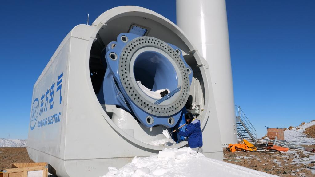 在位于新疆木壘哈薩克自治縣東南部的東方電氣木壘100萬千瓦風電項目現場,零下12度的環境下,東方風電木壘項目團隊成員羅宇軒、黃昌毅先后在清理機艙內和路面的積雪,暢通運輸道路,為風機吊裝做好準備,全力推動項目年內建成投運。