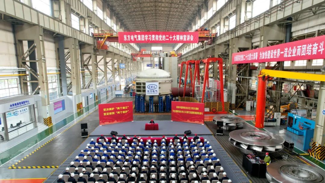 本網訊 11月10日,四川德陽天朗氣清,東方電氣集團所屬東方電機的大型清潔能源裝備重型制造數字化車間巨型部件錯落有致,坦桑尼亞朱利諾水電項目巨型蝶閥展現“重器”力量,這是東方電氣集團學習貫徹黨的二十大精神首場宣講會現場。當天,黨的二十大代表,東方電氣集團黨組書記、董事長俞培根在車間一線宣講黨的二十大精神。