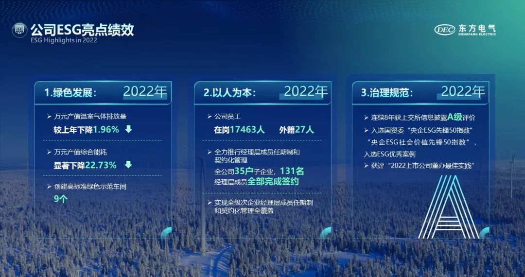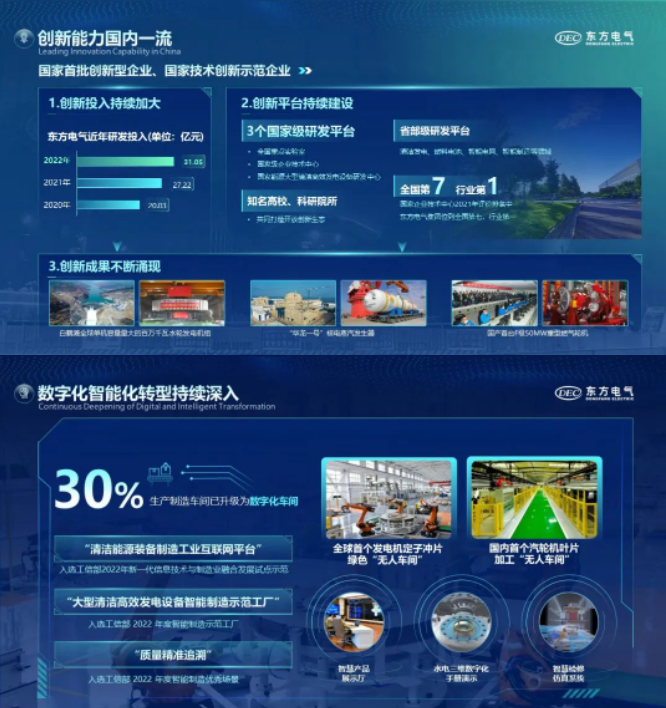 2022年,公司堅持科技創新戰略引領,制定發布中長期科技創新規劃;強化創新平臺建設,構建領先的水電、氫能等產業創新聯合體。科技創新成果突出,完成國內首臺自主知識產權F級50MW重型燃氣輪機等一批科技創新成果。公司堅持綠色轉型與數字化轉型協同發展,發布碳達峰碳中和行動方案、數字化轉型行動計劃,創新驅動企業核心競爭力不斷提升。
