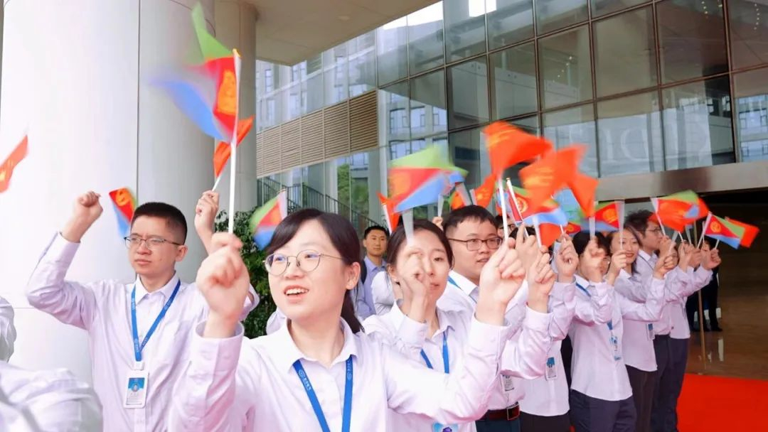 東方電氣科技展示廳前,東方電氣青年代表排列整齊,熱情揮舞著中厄兩國國旗,熱烈表達著對伊薩亞斯一行的歡迎之情。