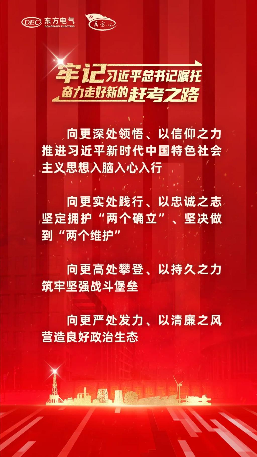 各級(jí)黨組織和全體黨員干部職工務(wù)必要以“東方心”黨建品牌為引領(lǐng),以黨建“三年攀高計(jì)劃”“登高而招”為牽引,向更深處領(lǐng)悟,向更實(shí)處踐行,向更高處攀登,向更嚴(yán)處發(fā)力,接續(xù)奮斗、勇毅前行,形成全集團(tuán)共擔(dān)使命、共譜新篇、攜手奮進(jìn)、萬(wàn)馬奔騰的生動(dòng)局面,以東方電氣的“穩(wěn)”“進(jìn)”“立”為全國(guó)大局作出新的貢獻(xiàn)。