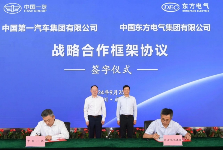 本網(wǎng)訊 9月25日,中國(guó)東方電氣集團(tuán)有限公司與中國(guó)第一汽車集團(tuán)有限公司在蓉簽署戰(zhàn)略合作框架協(xié)議。在東方電氣集團(tuán)黨組書記、董事長(zhǎng)俞培根,中國(guó)一汽集團(tuán)黨委書記、董事長(zhǎng)邱現(xiàn)東的共同見(jiàn)證下,東方電氣集團(tuán)黨組成員、副總經(jīng)理孫國(guó)君,中國(guó)一汽集團(tuán)黨委常委、副總經(jīng)理吳碧磊代表雙方簽字。